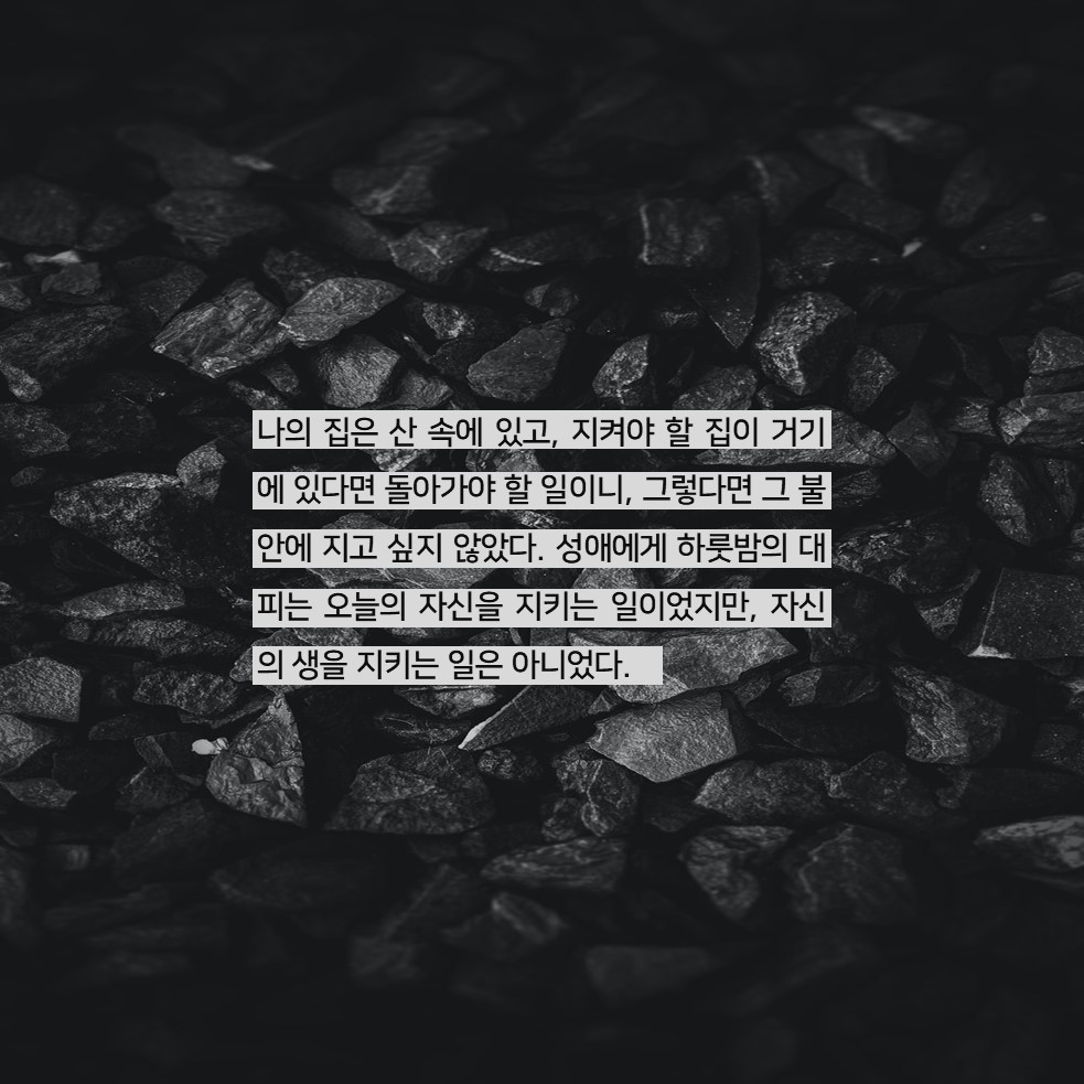 집으로 돌아가는 길은 오늘따라 더 새카매진 것 같았다. 성애는 발걸음이 급해지지 않도록 평소의 속도를 생각하며, 한 걸음 한 걸음 몸을 움직였다. 수풀과 나무 사이에 지켜보는 눈이 있다는 상상만으로 속이 울렁거렸지만, 성애는 자신의 불안을 들키고 싶지 않았다. 두려움이나 불안을 들키는 것만큼 바보짓이 없다는 걸, 성애는 잘 알고 있었다. 겁에 질린 놈에게 제일 먼저 달려드는 건 짐승이나 인간이나 다를 게 없었다.