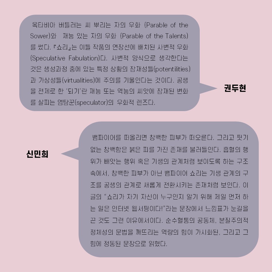 확실히 옥타비아 버틀러의 소설이 그리는 뱀파이어와 인간의 공생 서사는 “아기가 아니라 친족을 만들라”는 해러웨이의 슬로건을 떠올리게 한다. 피와 혈통의 문제를 오랫동안 탐구해온 버틀러는 그의 마지막 소설 『쇼리』에서, 기존의 혈연이나 혈통 개념과는 다르나 친족을 만드는 매개인 피로 연결된 공동체의 새로운 이미지를 상상해 낸다.